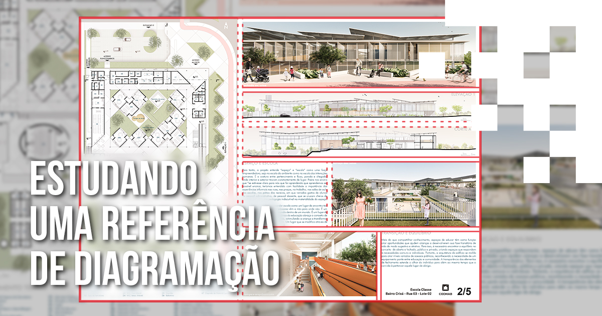 Neste artigo pegamos as pranchas de uma proposta do escritório 24.7 para um concurso da CODHAB/DF para uma escola no Bairro de Crixá. Diferente de outros concursos que normalmente temos que resolver toda a diagramação em uma prancha só, estes concursos da CODHAB costumam trabalhar com 5 a 6 pranchas e também com uma prancha síntese única compilando as informações importantes. O interessante de se analisar a diagramação de várias pranchas é que isso é o mais comum que acontecerá no dia-a-dia de uma apresentação de projeto, seja para clientes ou para a faculdade.
